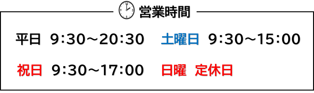 受付時間:9:30~20:30(月~金)9:30~15:00(土曜日)9 : 30~17:00(祝日) 定休日 日曜日